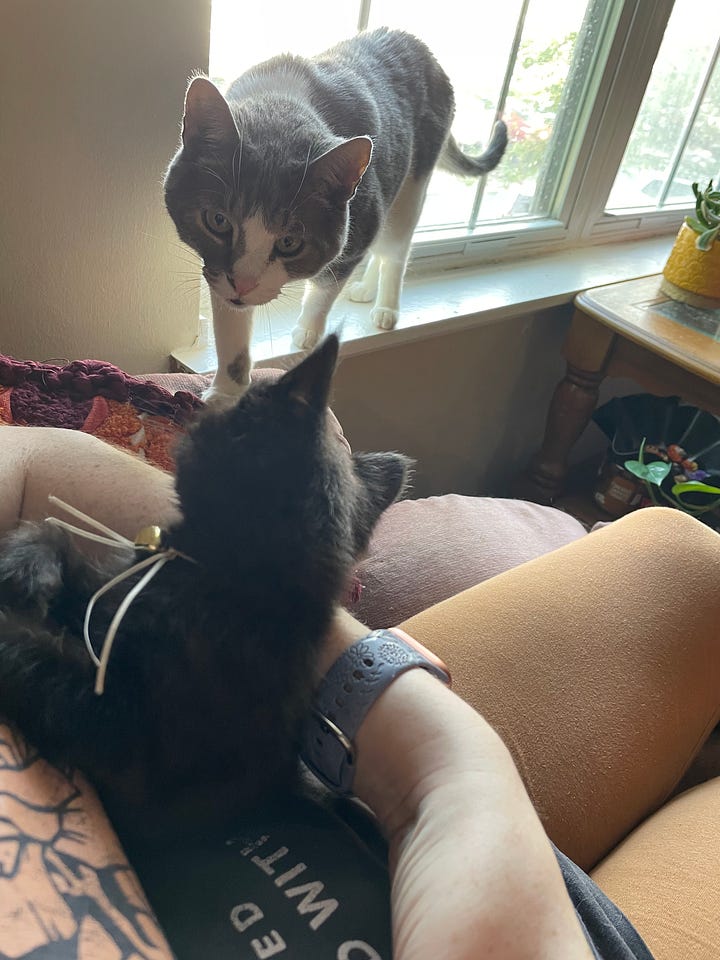 Matilda is doing really well, considering it’s only been a few days and she as a rule dislikes it when anyone invades our home. She hid under the bed the first day and was furious with me but is coming closer and closer and can be in the same room with the kitten, as long as they’re not too close. But she’s trying! My hope is that they’ll eventually be friends and snuggle up together, but that’s definitely going to take some time. We’ve lived 9 years just Matilda and I and it’s going to be an adjustment.