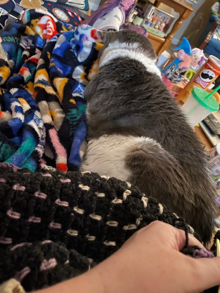 Eighteen. Yes, you read that right, 18 blankets. Fleece blankets, fuzzy blankets, thin blankets, thick blankets, new blankets, vintage blankets. So. Many. Blankets. At this very moment I am sitting on my couch with two different movie night themed printed fleece blankets2 draped over my lap and legs (I am nothing if not on-brand). To add to the coziness my cat Matilda is snuggled in on top of those blankets because she loves them as much as I do — she will fuss until she can knead it and feel the soft fabric on her little kitty paws. We're quite a cozy pair over here.